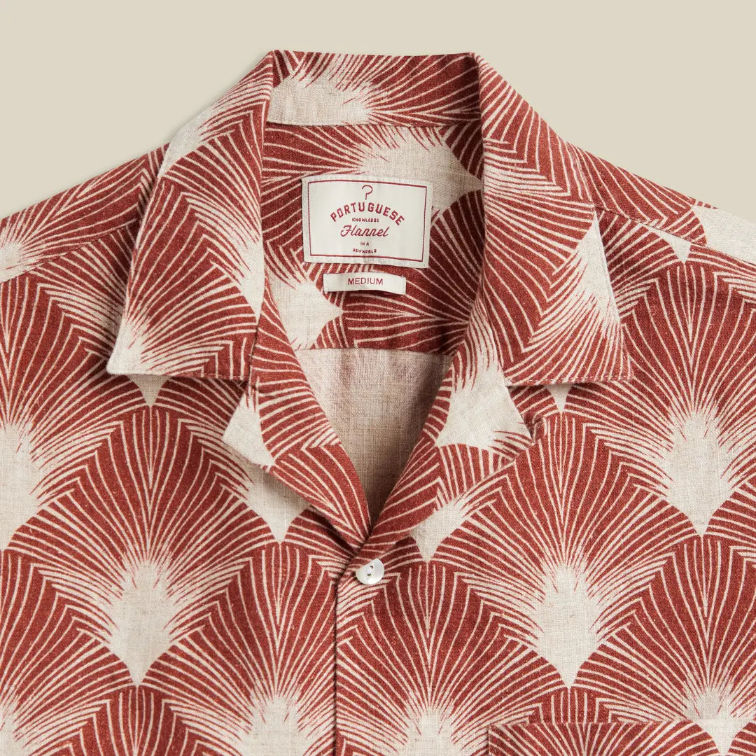 Cette chemise à manches courtes est un modèle fort de caractère signé Portuguese Flannel, confectionné avec soin au Portugal. Elle se distingue par son motif graphique inspiré des années 50, mêlant des tons terracotta et écru pour un rendu à la fois chaleureux et original.