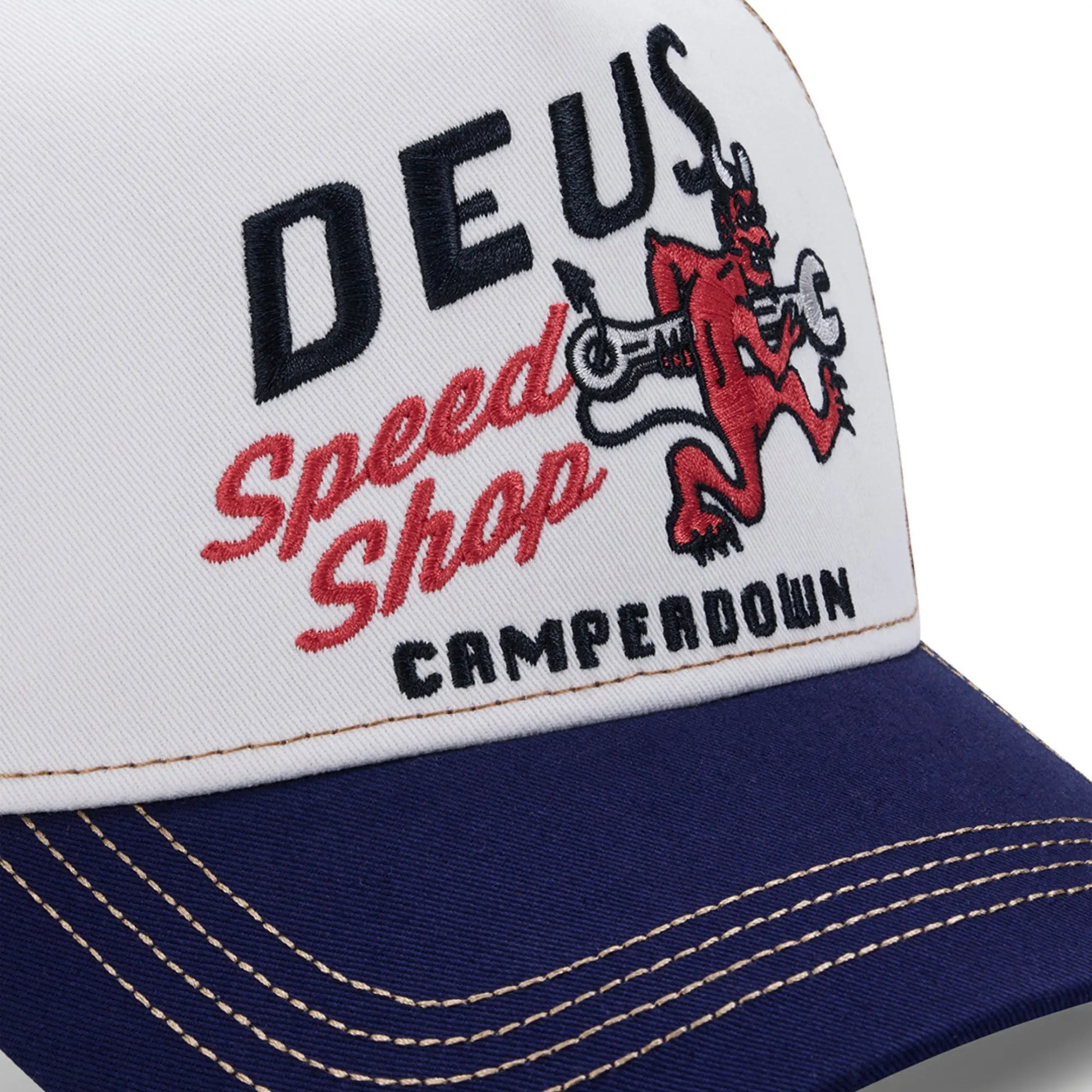Casquette trucker classique à pincement frontal avec fermeture à pression en plastique, broderie sur le devant, surpiqûres contrastées en sergé de coton
